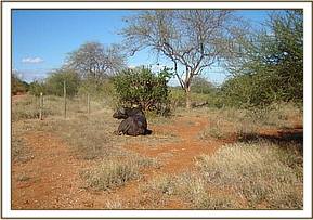 The same time we received the above report, we also received that of a buffalo with a snare at Ziwani in Tsavo West. To enable us to attend to both cases, I was airlifted to Ziwani while the vet truck followed and connected with it at the Kimana sanctuary. We could however not find the buffalo, even by air, in the general area where it was last seen. Because the pilot had other engagements in Tsavo East, he airlifted and left me at Kimana airfield where a vehicle from Amboseli was waiting. Meanwhile, KWS rangers were requested to locate the buffalo and relay the report to Amboseli if they found it. We passed through Ziwani the following day on our way back to Voi and found the rangers searching for it. We joined them for about 2 hours and when there were no signs of it we left for Voi via Maktau.