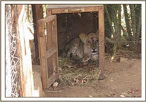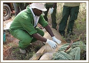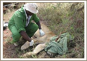In late April, a lion in a pride of 14 that ranges around the Tsavo East park headquarters and across the Voi river in Ngutuni sanctuary was reported injured by a buffalo as they were hunting. The report said that the right fore leg was fractured and it could not move. We however did not find the pride that day as well as several days thereafter to confirm the report and assist the lion. It reappeared at Ngutuni lodge on the 16th May and the management called to inform us. We observed that the lion was lame on the right foreleg but there was no visible external injury. Because the lion could slightly use the leg, we tentatively ruled out fracture but we immobillised it for examination and diagnosis of the problem.