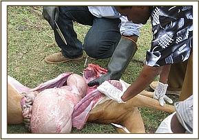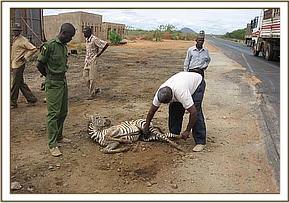 A zebra foal was knocked by a vehicle at Manyani shopping centre and sustained multiple fractures at different levels of the left hind leg. It was euthanised with 20% pentobarbital sodium intravenously to stop further suffering because no treatment was feasible under field conditions.