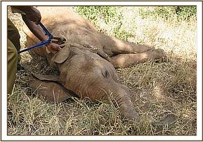 On the 28th another juvenile elephant was also treated for an arrow injury near the Voi gate. The injury was mildly infected and in the process of recovering. It had no foreign object inside.
