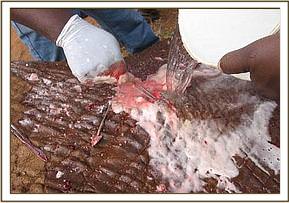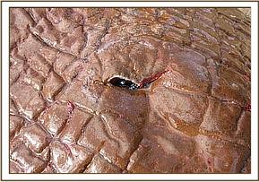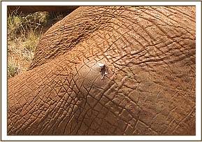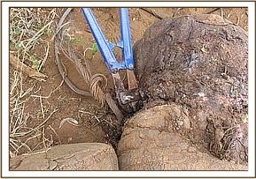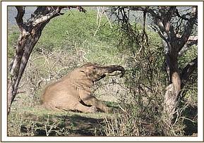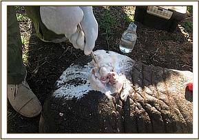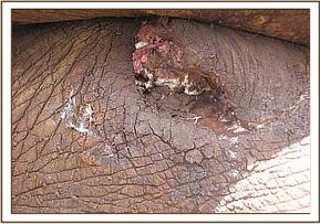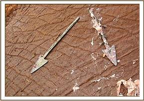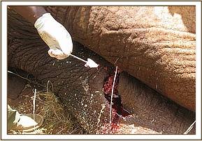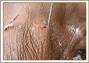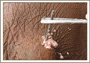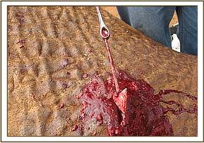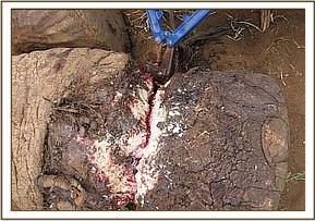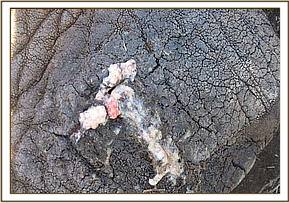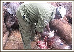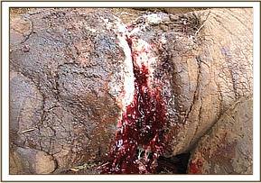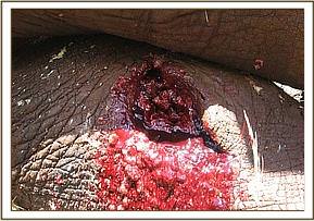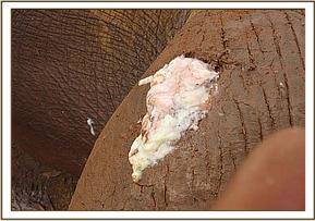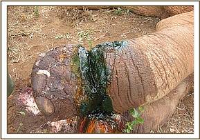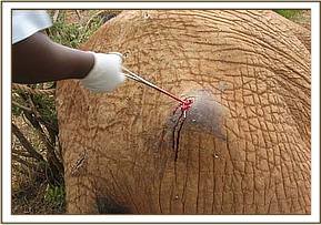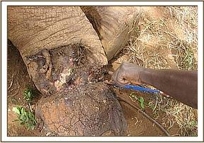 The fourth elephant with an arrow head deeply lodged at the medial aspect of the right fore leg was treated at Rukinga ranch. The injury was heavily infected and extensively spread under the skin. Necrotic tissues were debrided after cleaning the wound. It was topically treated and an antibiotic cover given.
