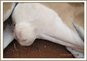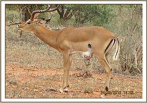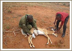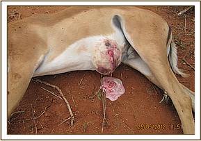 Impala case with swollen ventral abdomen, 25th May. The male Impala, resident of Voi gate in Tsavo East was spotted by tourists with a swollen abdomen near the umbilicus. Darting was done with 2 mgs of etorphine and 10 mgs Xylazine. Physical exam and aspiration indicated a strangulated hernia with tissue necrosis and suppuration. Due to heavy infection and non feasibility of any operation, euthanasia was indicated.