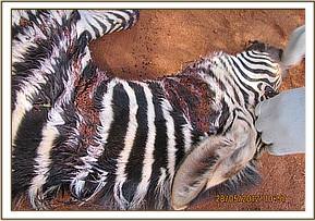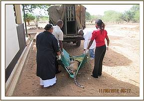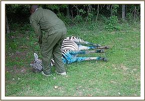 Rescue of an injured Zebra foal in Manyani, Tsavo West. 28th May. Zebra calf rescued after suspected leopard attack was examined treated and transported to Tsavo East research station for monitoring but succumbed to the injuries five hours later. Autopsy results indicated death due to excess hemorrhage from severed jugular vein.