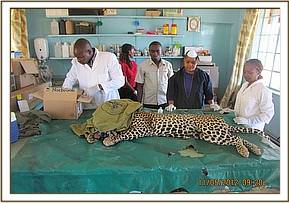 Examination and release of a problematic leopard from Northern Tsavo East, 11th May 2012 Leopards continue to be a source of conflict in areas where prey species have been reduced or decimated through bush meat activities, this are mostly in areas in community lands and ranches. The leopard was trapped after killing several goats in northern Tsavo East Park. It was brought to the clinic where it was anaesthetized and examined. The canines and claws were observed and found to be in good condition. Being in good body condition, he was released back to the park near Galana River. Leopards attack livestock usually when there is no prey available or its too old to hunt hence targets easy prey.