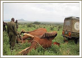 Cats are some problem causing animals within the Tsavo ecosystem and rank only next to elephants in damage caused. This particular lioness was trapped in Kutima ranch within Taita ranches for preying on livestock. She was immobilized using ketamine 300 mgs mixed with meditomidine 4 mg. Wounds on the body were treated and long acting antibiotics administered. The lioness was transported to powerline area of Tsavo east and released in good condition after injection of antisedan hydrochloride. Immobilization and euthanasia of an injured elephant bull in Salaita area, Tsavo west 31st May