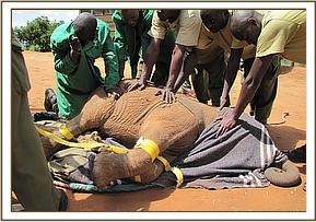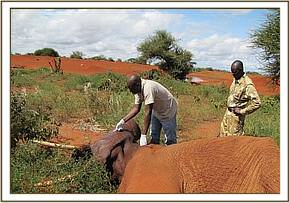 Cases of arrow wounds targeting mostly elephant bulls have been on the increase in the recent past within the conservation area. The bull was spotted near the Voi gate with pus oozing from the body side. Darting was done using 18 mgs of etorphine in a dan inject dart system and but unfortunately the elephant fell on the wounded side. A vehicle was used to turn him over and expose the wounded flank. The arrow wound was cleaned using clean water mixed with hydrogen peroxide in a ratio of 1:1. Tinture of iodine and oxytetracycline spray was then sprayed and a final cover of green clay applied. The elephant was declared able to heal with good prognosis and anaesthesia reversed using diprenorphine at 3 times the etorphine dose. Rescue of an abandoned elephant orphan in Aruba, Tsavo east 29th May