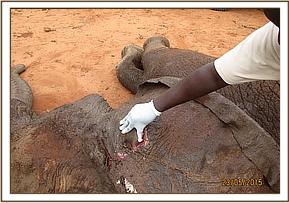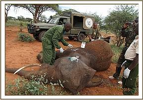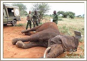 The elephant was immobilised using 16mg Etorphine in a 3 ml Dan - inject dart using a Dan inject dart rifle from a vehicle. The elephant was immobilized after 5 minutes. The elephant fell on the lateral side and the team went into action with the rangers pouring water on the ears while the vet undertook the examination.