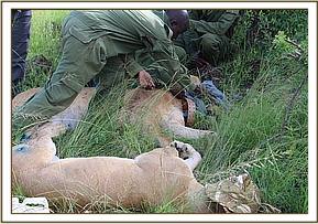 The lionesses were tracked using the old collar which still had its GPS component working. The collars were fitted with enough space to allow the lions to feed and move with ease. The lions were revived one and half hours later using 2.5 mgs of Yohimbine Hcl and monitored until they moved away on their own. Further follow up reports indicate they are doing well with the satellite component sending signals.