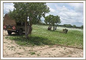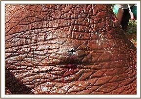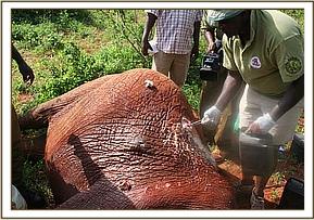 Another case was that of Ol Malo in the elephant stockades at Ithumba in Northern Tsavo East. The 7 years old elephant released back to the wild after several years of rehabilitation was reported to have an abscess at the ventral abdomen that required the Unit’s attention. Abscesses in elephants may have serious consequences if not treated early as they may spread beneath and undermine the skin rather than rupturing externally. Infection may spread extensively under the skin resulting in necrotizing fasciitis, sepsis and death. However, examination revealed an umbilical hernia rather than an abscess. These are not uncommon in elephants especially in very young ones where they may result from a congenital defect in the muscles of the abdomen resulting in an abnormal protrusion of abdominal contents through the defect. Treatment is surgical to close the opening. This would be successful in very young elephants but not at Ol Malo's age for serious complications such as suture dehiscence and infection can arise with serious consequences. It is believed that Ol Malo who had been lost for many months without appearing at the stockades sustained some trauma on the umbilical area resulting to a weak spot or rupture of the muscles that permitted intestines to bulge through it. The hernia contents could be pushed back into the abdomen. It will be observed closely for progress.
