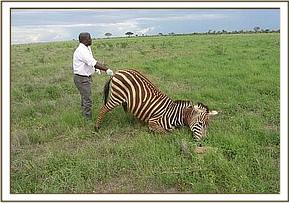 An adult female zebra with a tight snare that inflicted an extensive injury round the neck was also treated at the pipeline area in Tsavo East. Despite the seriousness of the injury, the animal had a good prognosis because the vital structures in the neck were intact. The animal was in good body condition.