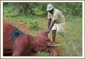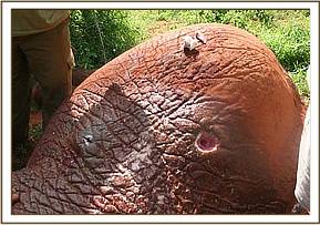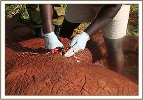 Another activity during the month was the treatment of Seraa, a seven years old elephant rehabilitated and released two years ago into the wild. The elephant had two arrow wounds on the chest area. One of the injuries was quiet deep and the arrow seemed to have been thrown at close range and at high velocity for it had caused some damage on one rib. Two bone fragments were retrieved from the injury. After a lot of probing the wound and ascertaining that the arrow head was not lodged inside, the animal was given a good prognosis. The other injury was not serious. A high dose of systemic antibiotics were given, the wounds topically treated and the animal revived.