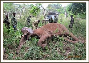 The only observation was the empty stomach with only mucous lining its walls. The empty stomach in a species that is known to feed throughout the day is extremely abnormal and probable causes could be oesophageal obstruction among others. The tusks were removed and handed to the warden in charge of the park.