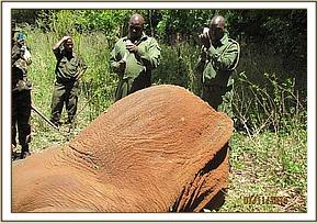 An elephant was reported sick in Amboseli National Park and because the Amboseli Vet Unit was off duty, the Tsavo vet was airlifted by a DSWT aeroplane to Amboseli to treat the now recumbent elephant bull. On the way the team received a report that the elephant had succumbed so the team proceeded to perform an autopsy.