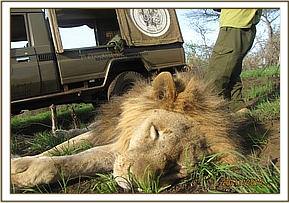 The lion was immobilized using 300 mgs of ketamine and 4 mgs of meditomidine Hcl late in the afternoon after being spotted in the wildlife sanctuary. The first dart was deflected by a shrub and the second dart was well placed. The female in proximity was separated from the male 8 minutes after darting of which the drugs had taken effect. The collars were fitted with enough space to allow the lion to feed and move with ease. The lion was revived one anda half hours later and monitored until he moved away on his own. Further follow up reports indicate he is doing well and was seen mating later the next day.
