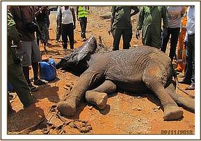 Examination revealed it was too weak to survive alone so it was rescued and transported to the Voi stockade for treatment and care. He was administered 50 % dextrose bolus IV and a further slow IV lactated ringer’s solution through the ear vein. Further administration of long acting Amoxicillin and Dexamethasone was done. He woke up and moved around the enclosure.