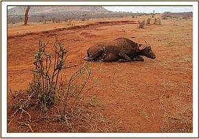 A report was received from Voi tourists of a buffalo that was lying down in a shallow water hole along the Mzima water pipeline near park headquarters. The team rushed in to find the recumbent buffalo in the water and unable to wake up. Closer examination revealed that the cow was weak and had deep bite injuries on the perineal area possibly inflicted by hyenas. It appears the buffalo was attacked by hyenas while experiencing dystocia. She was pulled out of the water and later euthanized to relieve her of pain. Death was deemed natural.