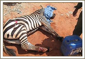 The zebra was immobilized using 6 mgs of Etorphine Hcl and 60 mgs of Xylazine in a dan-inject dart from foot using a dan-inject dart gun. She was darted in the rump and went down on the right flank after running for about 5 minutes.
