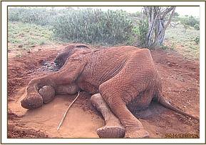 A report was made by KWS security staff of a young elephant that was lying down and unable to wake up near Voi River downstream from Satao tented camp. The family had left him and he was all alone. The vet team rushed to the area to find the small elephant lying down in lateral recumbency.