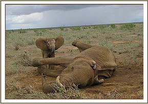 A report was made by KWS security staff of an elephant cow that was lying down and unable to stand between Mukwaju area past Satao. She was still alive and had a tiny calf standing beside her. Her family were also seen nearby.