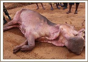 Treatment with antibiotics, colvasone, vitamin B12 complex and Dextrose IV bolus shots were administered but the response was minimal. Attempts to pull her onto her feet also proved unsuccessful. With poor prognosis she was euthanized and the tusks removed for safe custody. The poor condition is drought related though the recent rain has not been sufficient to get her health back.