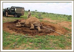 The Elephant cow appeared weak but was struggling to stand up. Treatment with antibiotics, colvasone, vitamin B12 complex and Dextrose IV bolus shots were administered but the response was minimal. A rope tied to the vet unit vehicle and looped on her tusk was used to aid her onto her feet.
