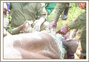 During the exercise, a rhino with a wire snare around its neck was spotted near Rhodesia hill in the IPZ and treated. After being darted as explained above the wire snare was cut loose, wound around the neck washed with water mixed with hydrogen peroxide at a ratio of 1:1, wound doused with tincture of iodine and finally spayed with Oxytetracycline antibiotic spray.