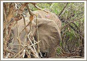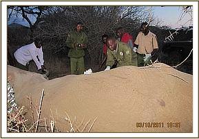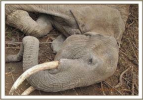Treatment of a male elephant with an arrow wound in Ol Donyo Wuas, 3rd October 2011. Ol donyo Wuas is a community conservancy under the Mbirikani group ranch with a variety of wildlife species. The elephants found here are male bachelor herds from the Amboseli ecosystem that are prone to poisoned arrow shots from poaching attempts. This case was spotted in a waterhole in Oldonyo lodge with a wound oozing pus from the flank and appeared weak. Darting was done using dan inject dart loaded with 17 mgs of etorphine Hcl alone. The wound was probed and a sharp arrow head retrieved from it. Cleaning with hydrogen peroxide and a final application of iodine was done. Anesthesia was reversed and the elephant was given very good prognosis.