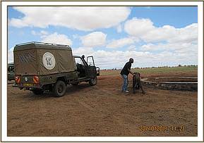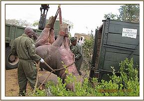 Translocation of a hippo from Satao Camp to Galana River, 8th October 2010. The prevailing dry spell has led to drying up of most seasonal rivers and dams, most remarkable is Aruba dam. Heavy farming upstream and habitat degradation has led to drying up of Voi river which now fills the Dam with silt during rainy days. Aruba dam previously held water for years way back, now hardly lasts for more than 2 months. Hippos that inhabit the dam wonder aimlessly in search of water bodies with some getting stranded in the dry land. A case is this one where a male hippo was kicked out of the watering hole in Satao after it could not accommodate five hippos. Posing danger to the tourists the hippo was translocated to Galana river 40 kms away. Darting was done using 3 mgs etorphine and 100 mgs of Xylazine. The hippo exhibited mouth gasping posture with weakened hind limbs. He was stabilized by use of butorphanol and doxopram. The hippo was placed into a crate and taken to Galana River near luggards where he was released.