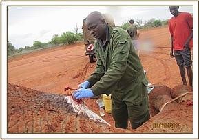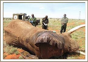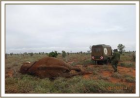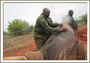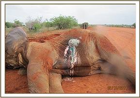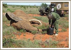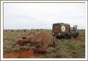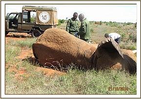 The area under review continue to experience dry weather with occasional showers barely enough to ensure greening of the semi-arid vegetation in the Tsavo ecosystem. Forage and water scarcity is being experienced across the region leading to poor body condition in most wildlife species with some elephant calves succumbing to the effects of drought. Case load decreased drastically with only four large bulls treated during the month unlike tens in the month of September. Cases treated included two bulls with arrow injuries near Dakota area of Tsavo East and rescue of stranded elephant calves in a dried up water hole along the Mzima water pipeline in Tsavo east.