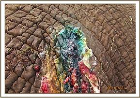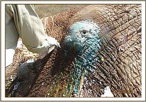 After the treatment of the first injured elephant bull another one was seen nearby with an injury to the flank with a small amount of pus oozing out. He was in a group of two other bulls.