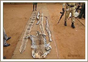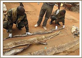 The python exhibits were spread in an open area and the length measurement taken as 4.6m, 3.4m, 2.9m and 2.7m while the leopard skin was skinned from an adult leopard. Two of the python skins were fresh and two were old; determined from the tissue debris attached to the skins. They are thought to be destined for illegal sale.