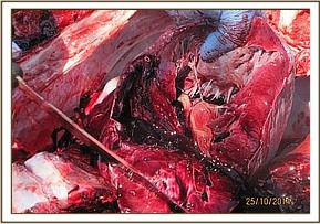 There was one arrow wound to the left lower abdominal flank and pus could be seen leaking from the injury. The wounds were opened and dead tissues and pus was removed. The wound was cleaned using water mixed with Hydrogen peroxide, doused with tincture of Iodine and sprayed with Oxytetracycline spray! Long acting antibiotics (Betamox LA) and Dexamethasone Hcl were injected parenterally.