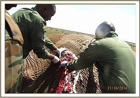 Five elephant bulls were spotted with injuries by an aerial recce undertaken by DSWT aeroplane and reported to the unit who promptly rushed to the area and joined a helicopter team for the treatment exercise. Of the five elephants seen, two were confirmed to need vet intervention.