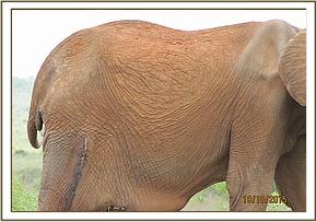 This elephant was seen by KWS personnel based at Dakota camp with an arrow injury to the right thigh but vanished. It reappeared with a swollen leg that extended to the abdomen with massive pus accumulation in the lower abdomen. She was accompanied with her 2 year old calf.