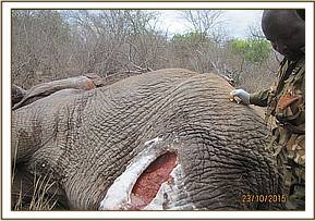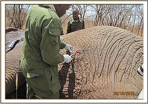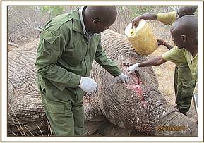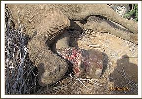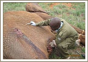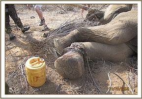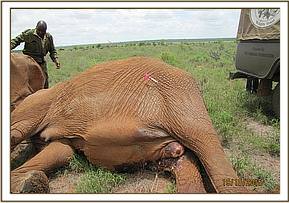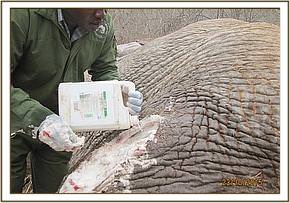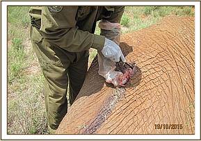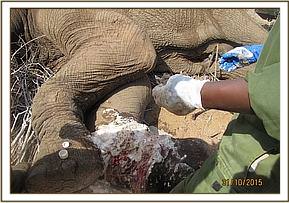 The elephant was immobilised using 16 mgs of Etorphine in a dan-inject dart from a vehicle. The elephant was immobilized in 4 minutes and went down lying on the injured flank. Ropes fastened to the front legs were used to roll her over using the vet vehicle.