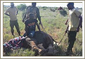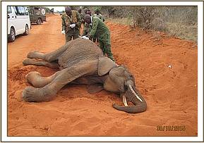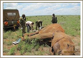 Anaesthesia reversal was done by administration of Diprenorphine at three times the Etorphine dose intravenously through the ear vein. She struggled to wake up and was assisted by ropes hooked on the tusks and the land cruiser but could not lift herself up despite being pulled to sitting position. She collapsed and died an hour later. The calf was captured and taken to the Voi stockade.