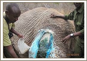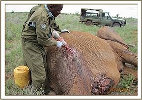 The elephant was seen near the Komboyo water hole with a wound on the left abdominal wall by DSWT patrol aircraft. The team rushed to the area to find the bull moving slowly with two other bulls.