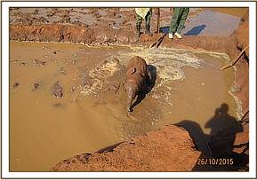This temporary water hole was created by leakages along the Mzima-Mombasa water pipeline and subsequently made deeper by elephants digging activity at the site. It provides water for elephants staying near the park headquarters during the dry season when most of the water holes are dry. Visitors to the area reported an elephant calf that was struggling to climb over the walls in vain. The vet team together with the Voi stockade team rushed to the location to find the calf stuck in the water hole with the mother attempting everything to help. The mother was pushed away and the calf rescued and re united with his mother.