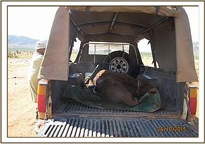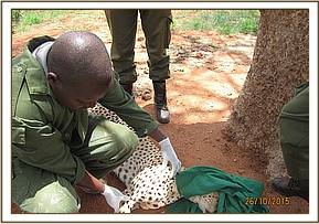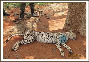 The cheetah was immobilized using 70 mgs of Ketamine and 1 mg of Meditomidine. He was fully immobilized using in 10 minutes. The shoulder muscles had fresh bite wounds thought to have been inflicted by a lion attack.