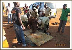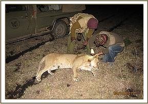 The first lioness was immobilized using 300 mgs of Ketamine and 4mgs of Meditomidine Hcl late in the afternoon after being spotted in the Wildlife Sanctuary; another dart was added to fully immobilize the lioness. The second lioness (Namunyak) was immobilized on the night of 4th October by aid of night vision equipment.