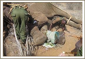 An arrow head was retrieved and the wound cleaned using Hydrogen peroxide mixed with water then, doused with Iodine and covered in green clay. During treatment the female’s calf stood at a distance.