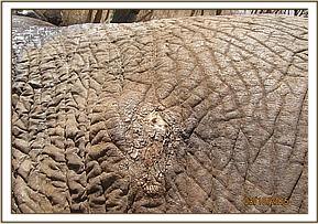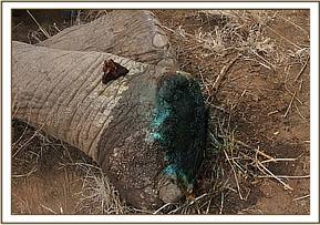 There was an arrow wound to the left thigh with massive tissue destruction and accumulation of copious amounts of pus. The elephant had lost a lot of muscle and appeared very thin. Large amounts of dead tissue was cut out and the pus drained by making an incision at the lowest point.