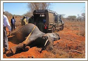 We found the carcass belonged to a male, bull elephant; it waslying on sterna recumbency with huge chunks of flesh removed by community members living nearby.There seemed to be no disturbance in the vicinity. Most of the internal organs had haemorrhages within. There was no external injury on the carcass that we could find.