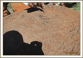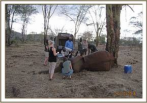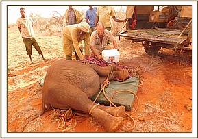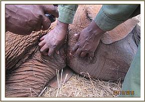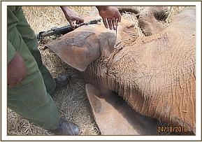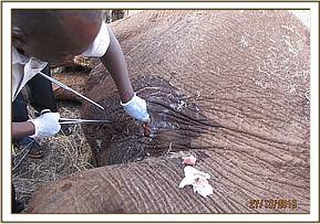 The Elephant was so stuck in the mud that treatment of an arrow wound on the thigh was undertaken without the need for anaesthesia. Pus was drained from the wound and it was further washed using water mixed with hydrogen peroxide and doused with tincture of iodine. It was finally covered in green clay. Long acting antibiotics and anti-inflammatory drugs were administered by injection.