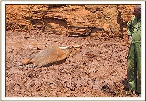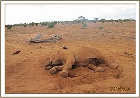 The dead elephant calves were spotted near the Dida Harea water pumb under a tree with no family around. The vet team was requested to find the cuase of the deaths. External examination revealed bite marks on the throats and back of the two carcases. The calves were very young, approximated between than 4-6 months old and in good body condition. No other injuries were observed. The injury marks indicated a lion attack on the calves. Thequestion we were not sure about is how the calves were attacked and the mothers and maternal family did not protect them, as is usually the case.