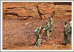The elephant was then pulled out of the mud using ropes tied to a land cruiser and assisted onto its feet with the ropes tied to the upper tusk. He struggled to his feet and moved away slowly, but still shaking from the trauma of being stuck in the mud for so long.