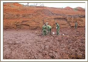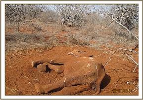 The carcass was male lying on lateral recumbency with slight carnivore activity on the carcass. The Elephant seemed to have struggled for sometime on the ground. The condition of the carcass was very poor rated at 2/5. No pathological changes were observed upon opening.