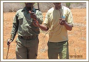 The waterbuck was spotted near the Voi gate with a wire snare dangling from its horns. Drugs were prepared with 6 mgs Etorphine and 40 mgs xylazine. The antelope was darted on the rump and went down after six minutes. The wire was not very tight and it was removed easily before the anaesthesia was reversed and the waterbuck walked off okay.