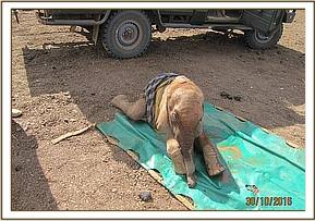 A report was received from the Aruba lodge staff of an elephant calf that was abandoned and unable to wake up near the Aruba water wind mill. The vet team together with the Voi stockade team rushed to the area to find the young elephant lying down and struggling to stand up. Examination revealed it was too weak to survive alone and was transported to Voi stockade for treatment and care.