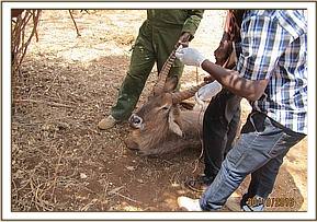 Immediately the vet team was alerted of another recumbent calf nearby. Both calves were rescued and taken to Voi stockade. At the Voi stockade they were administered with 50 % dextrose bolus IV and a further slow IV lactated ringer’s solution through the ear vein. Further administration of long acting Amoxicillin and Dexamethasone was done.